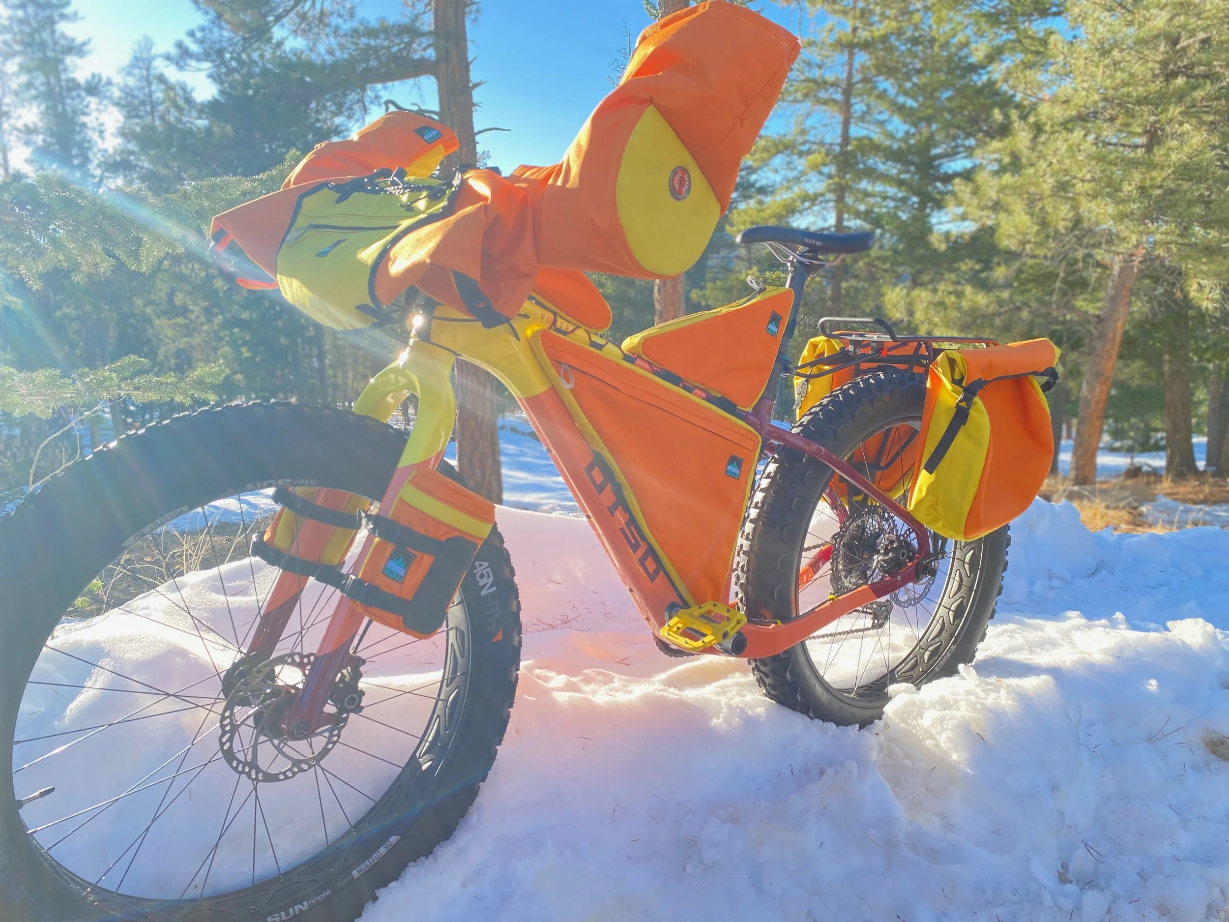 Spruce Cycles uses the best quality waterproof and UV Resistant outdoor fabrics, zippers, threads to help keep your precious load protected on Snow and Rain rides.